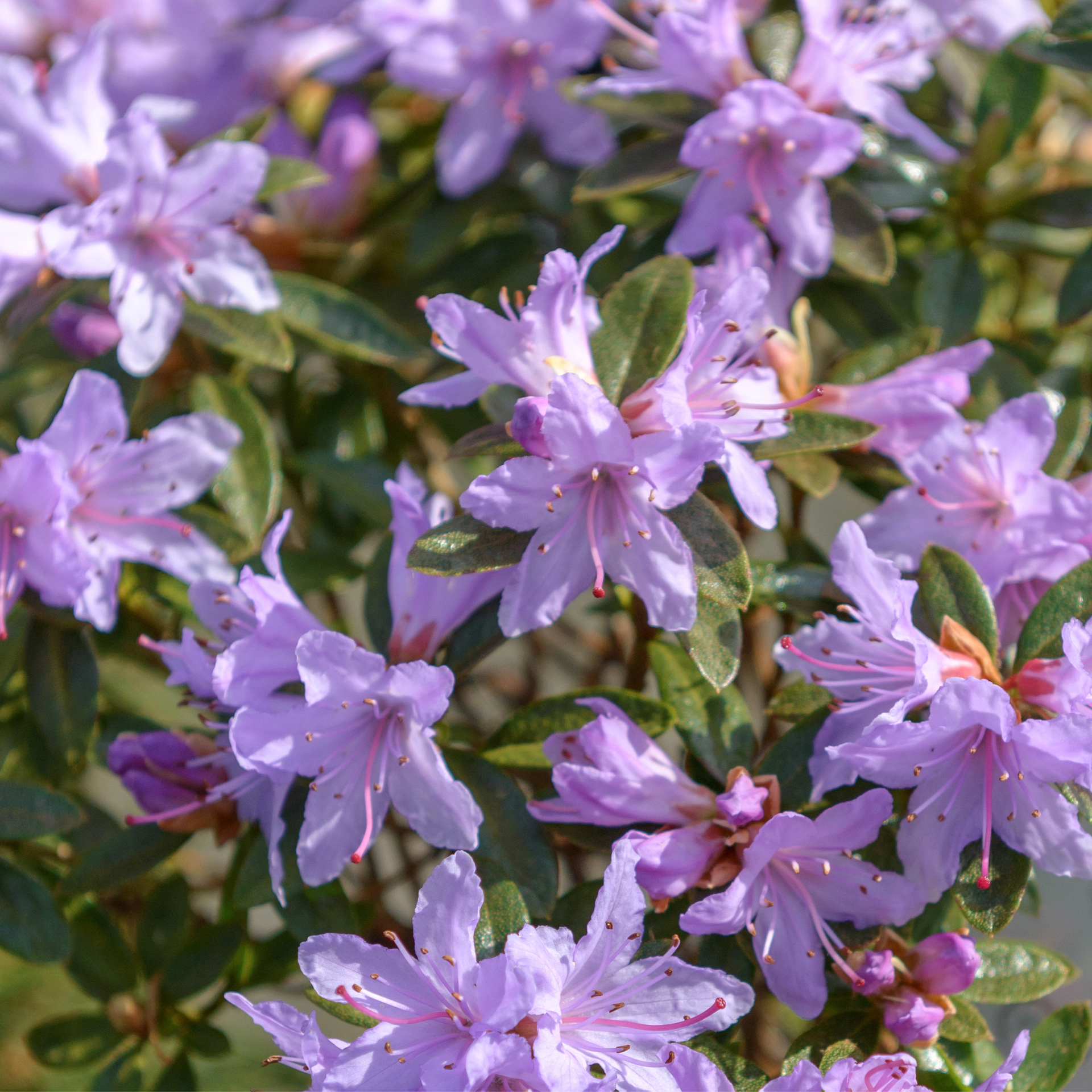 Der Rhododendron, auch Zwerg-Alpenrose genannt, ist ein kompakter, langsam wachsender Strauch. Er erreicht eine Wuchshöhe von 40cm und eine Breite von 80cm. Ende April bis Mitte Mai erscheinen violette Blüten.