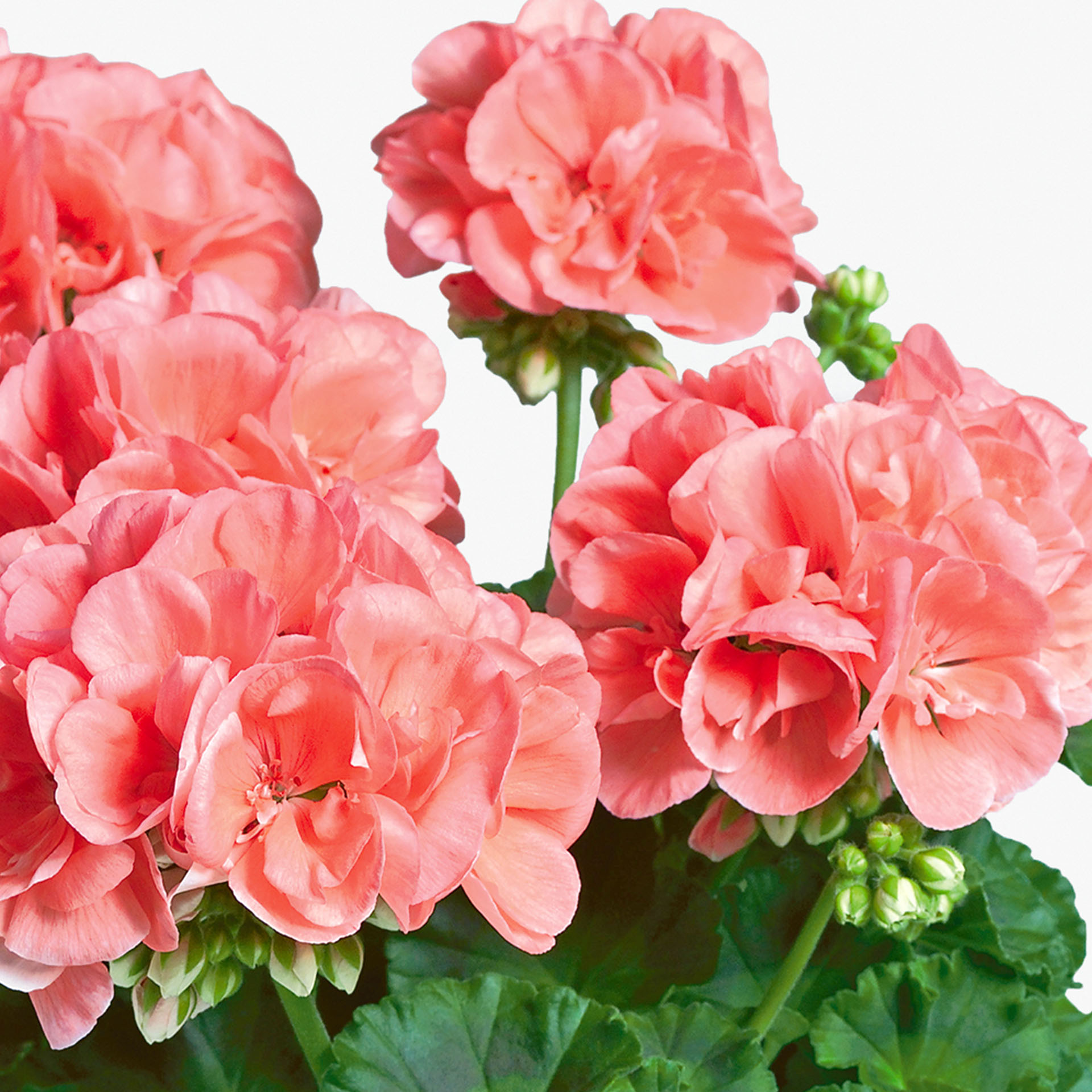 Die Geranie gehört zu den beliebtesten Balkonpflanzen, weil sie ein sehr robuster Dauerblüher ist. In unserer Gärtnerei kultivieren wir über 30 verschiedene Sorten von stehenden und hängenden Geranien. Die Sorte ‘Calais’ wächst kompakt mit hellgrünem Laub, das den typischen dunklen Streifen als deutliche Blattzeichnung trägt. Die Blüten sind lachsrosa und halbgefüllt. Von Mai bis Oktober wachsen immer neue Blüten nach. Sie erreicht eine Wuchshöhe von 30-50cm.