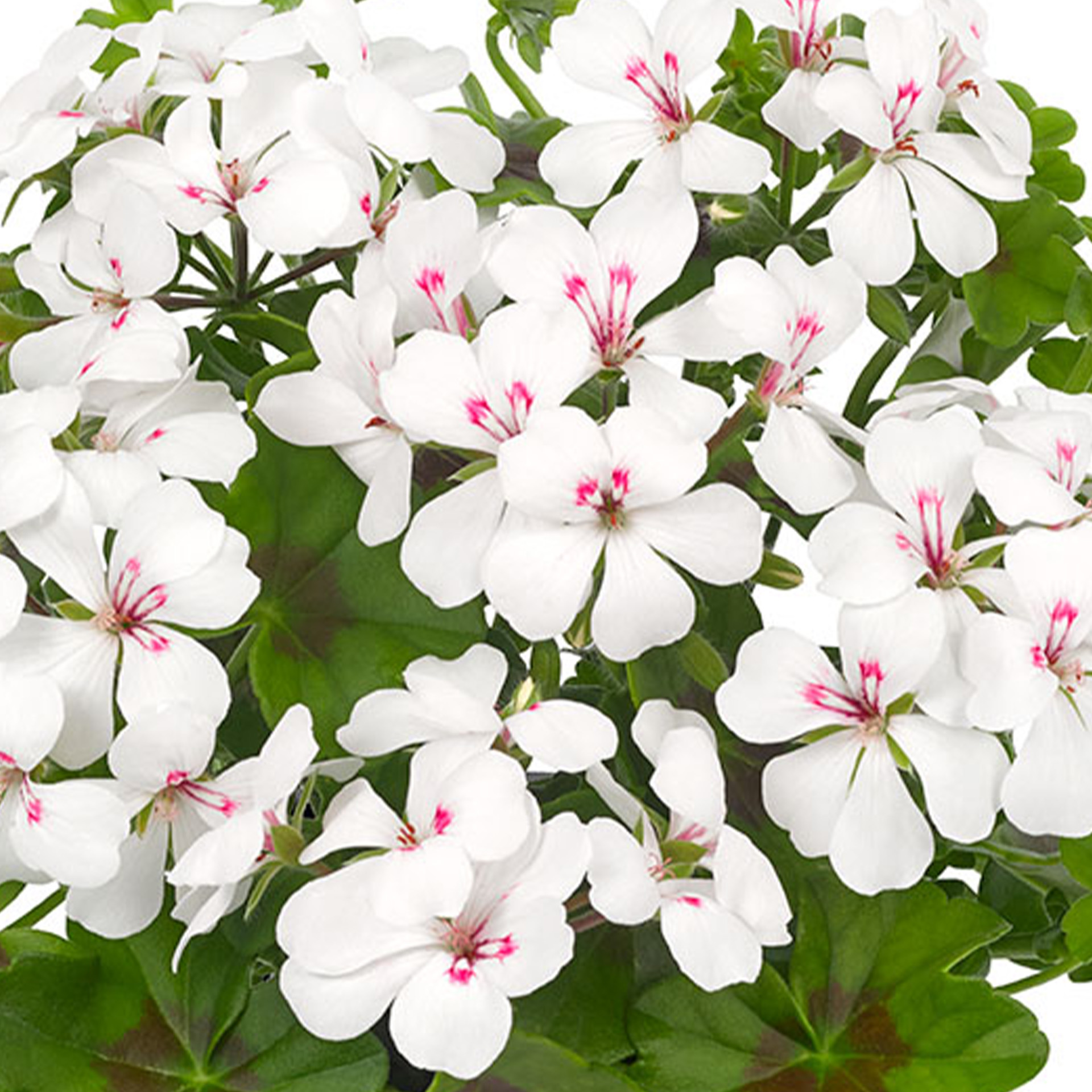 Die Geranie gehört zu den beliebtesten Balkonpflanzen, weil sie ein sehr robuster Dauerblüher ist. In unserer Gärtnerei kultivieren wir über 30 verschiedene Sorten von stehenden und hängenden Geranien. Diese Sorte hat einfache, weiße Blüten mit einer dezenten violettroten Zeichnung in der Mitte. Sie ist starkwachsend und gut verzweigend, mit bis zu 70cm langen Trieben. Von Mai bis Oktober wachsen immer neue Blüten nach.
