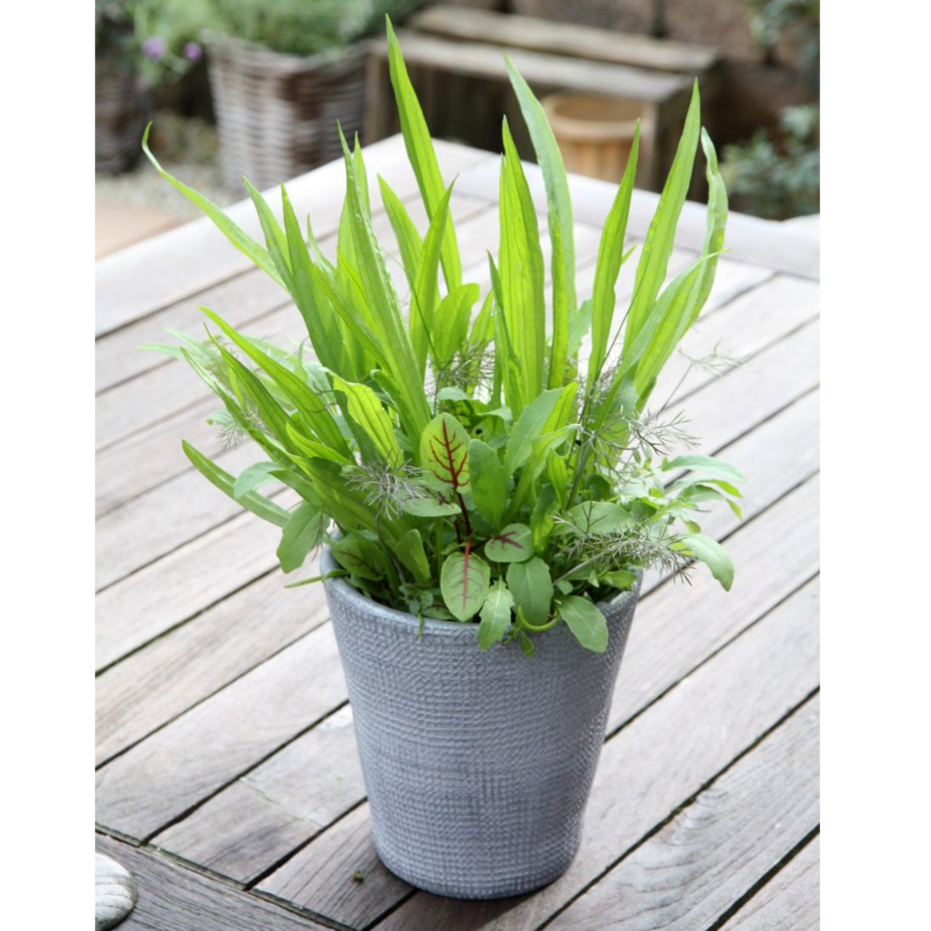 Mix aus Spitzwegerich, Rucola, Sauerampfer, Löwenzahn, Bohnenkraut, Fenchel, Schnittknoblauch. Wuchshöhe 20-30cm.