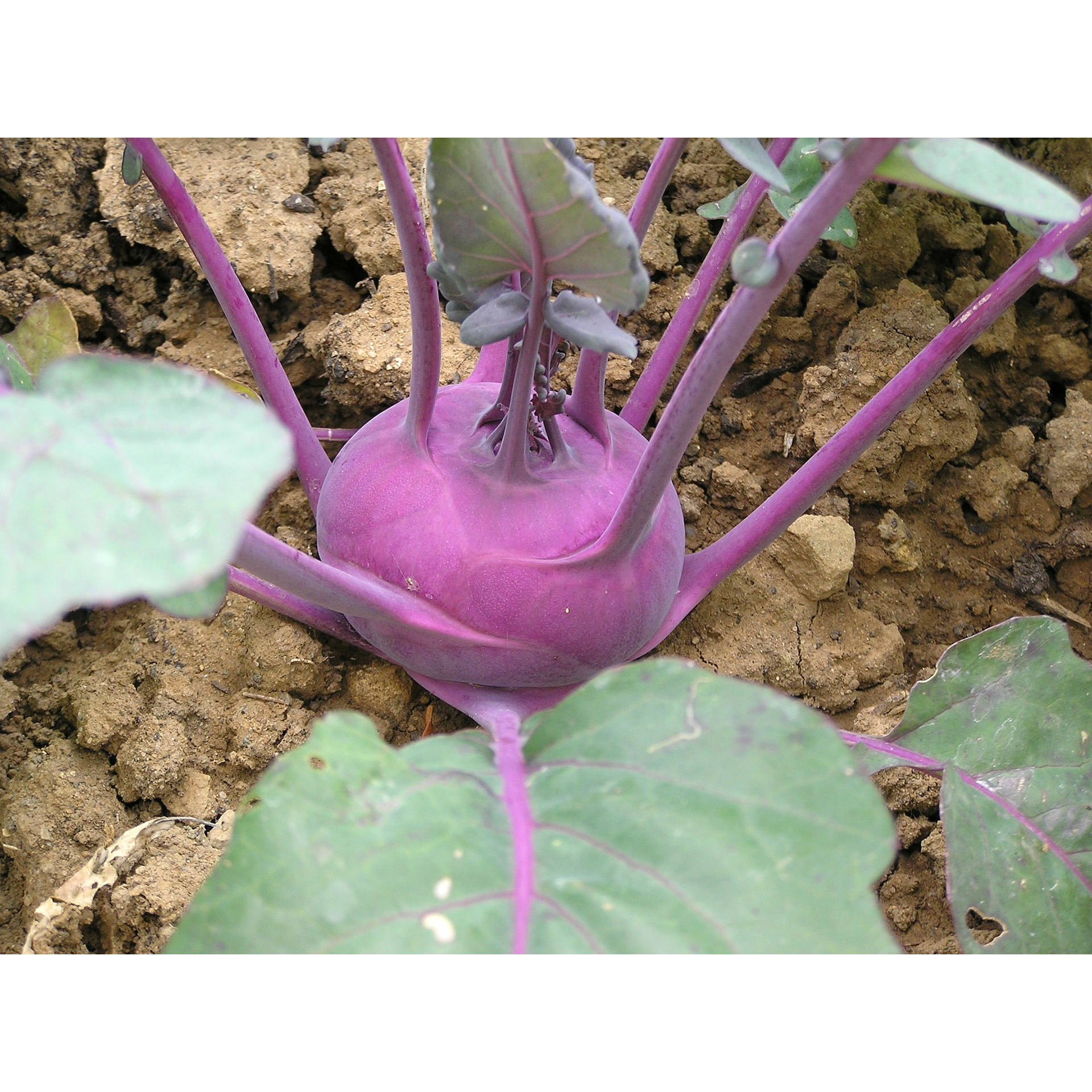 Blauer Kohlrabi wächst etwas langsamer als der weiße. Nur die Schale ist blau, innen sind die Knollen auch weiß. Kohlrabi ist verwandt mit Weißkohl und allen anderen Kohlarten. Im Geschmack ist er aber viel milder und hat nicht das typisch stechende Kohlaroma. Kohlrabi ist einfach anzubauen und auch für Anfänger gut geeignet. Die Pflanze bildet eine oberirdische Sprossknolle, welche 10-20cm Durchmesser erreichen kann. Das gesunde Gemüse enthält viele Mineralstoffe wie Kalium, Calcium, Magnesium sowie Vitamin A, Vitamin C und Folsäure.