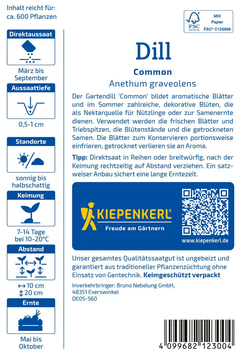 Verwendung: Beliebtes Gewürz für eingelegte Gurken, Fischgerichte und Salate. Zerkleinerter Samen eignet sich für Tee, besonders mit Kümmel und Fenchel wirkt er lindernd bei Blähungen. Haltbarmachung: Einfrieren, einlegen in Essig, Öl und Salz.