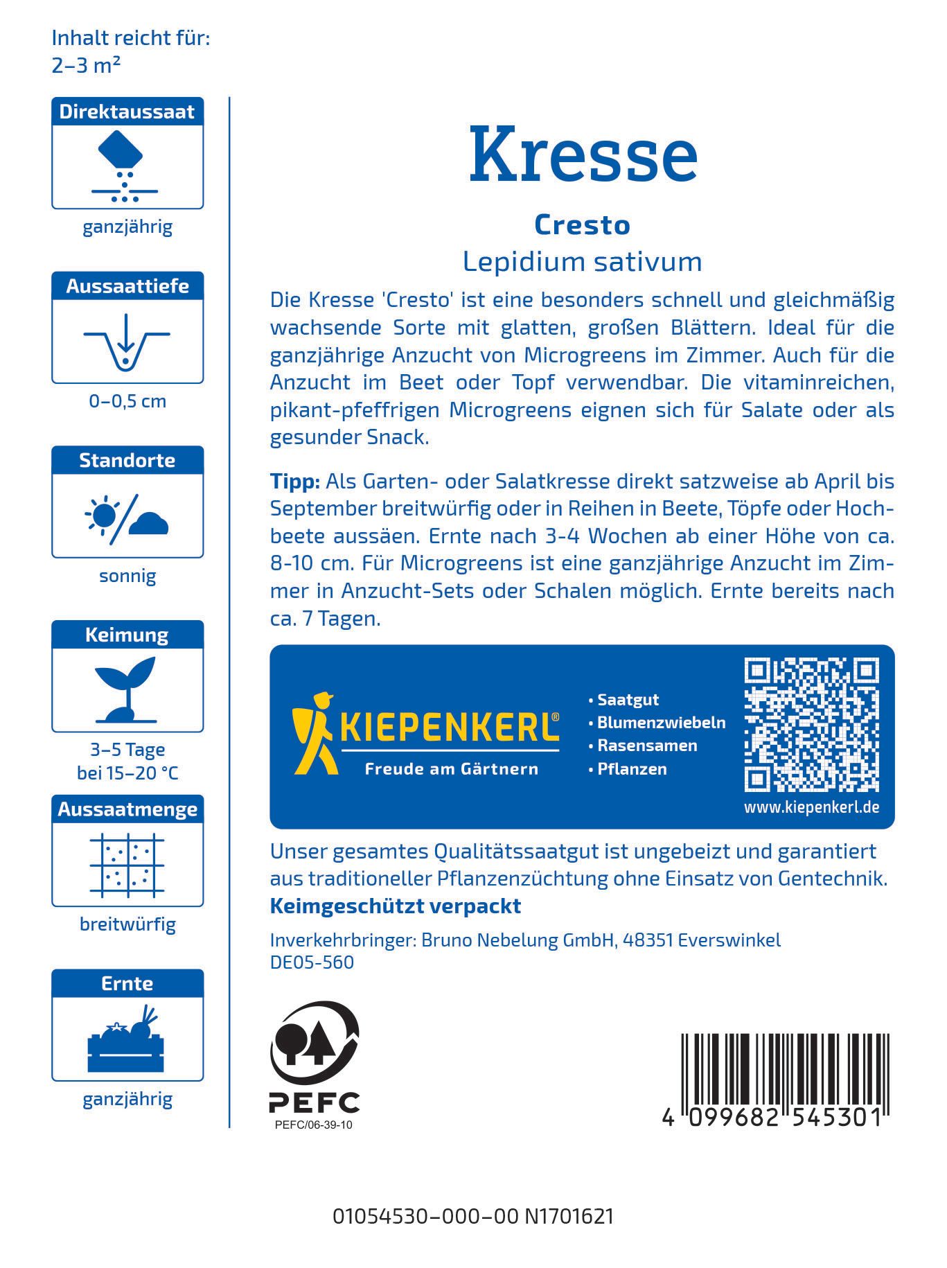 Kresse kann man in der frostfreien Zeit im Freien oder im Gewächshaus säen. Sie wächst im Beet, in Töpfen, Schalen und Balkonkästen. Ihr Geschmack ist intensiv aromatisch und pikant. Kresse besitzt einen hohen Vitamingehalt und ist deshalb auch im Winter eine gute Ergänzung von Speisen, wenn Gemüse aus frischer Ernte weniger verfügbar ist. Die frischen, jungen Blätter mit ihrem typischen Geschmack sind eine Bereicherung für viele Salate und auch herzhafte Quarkspeisen. Kresse ist und bleibt einfach der Klassiker für die schnelle, schmackhafte Würzküche und lässt sich kinderleicht drinnen und draußen heranziehen.