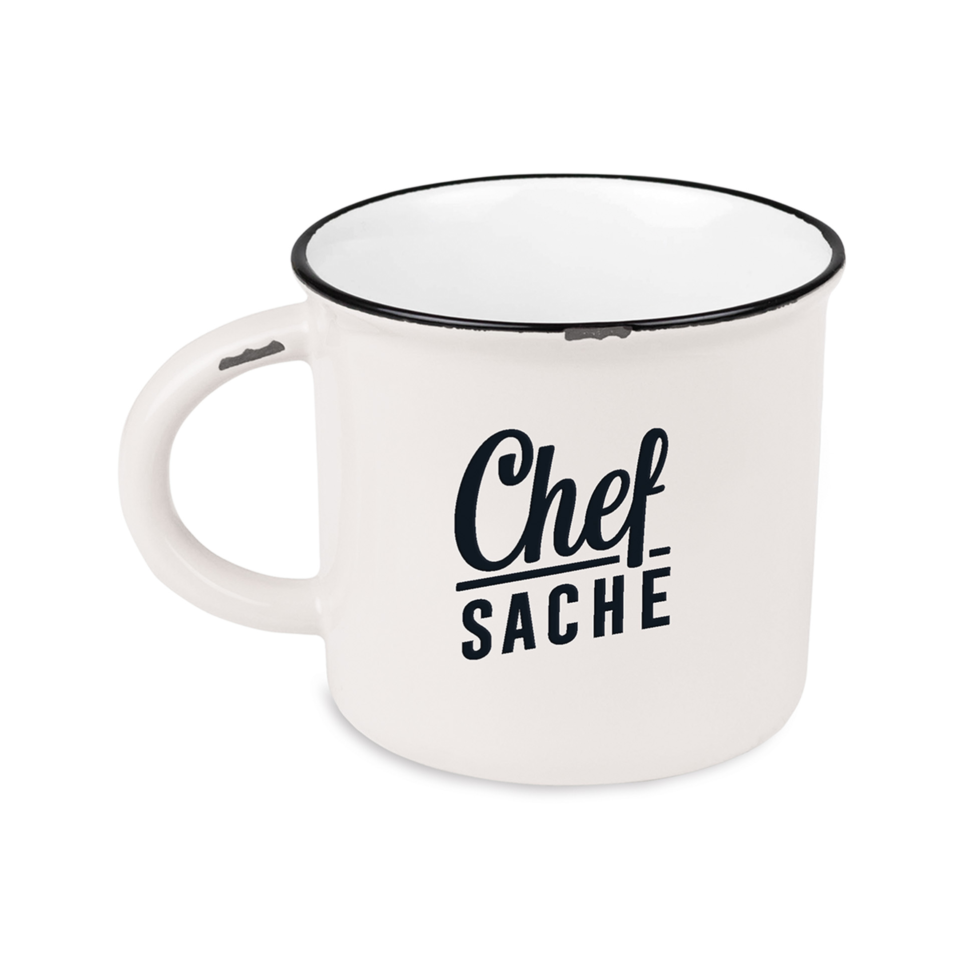 Vintage-Becher im Emaille-Look mit Henkel und Schriftzug 'Chefsache'.