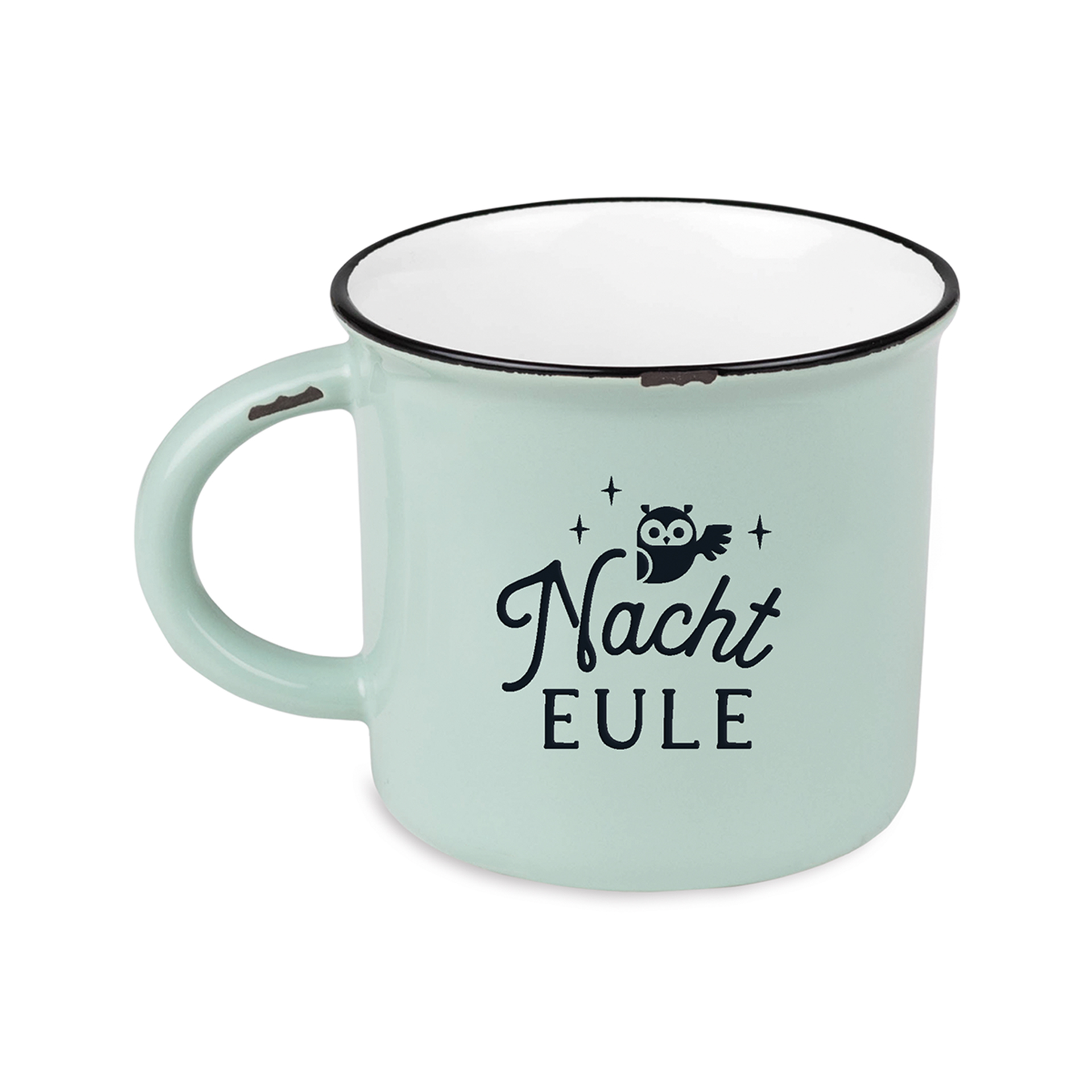 Vintage-Becher im Emaille-Look mit Henkel und Schriftzug 'Nachteule'.