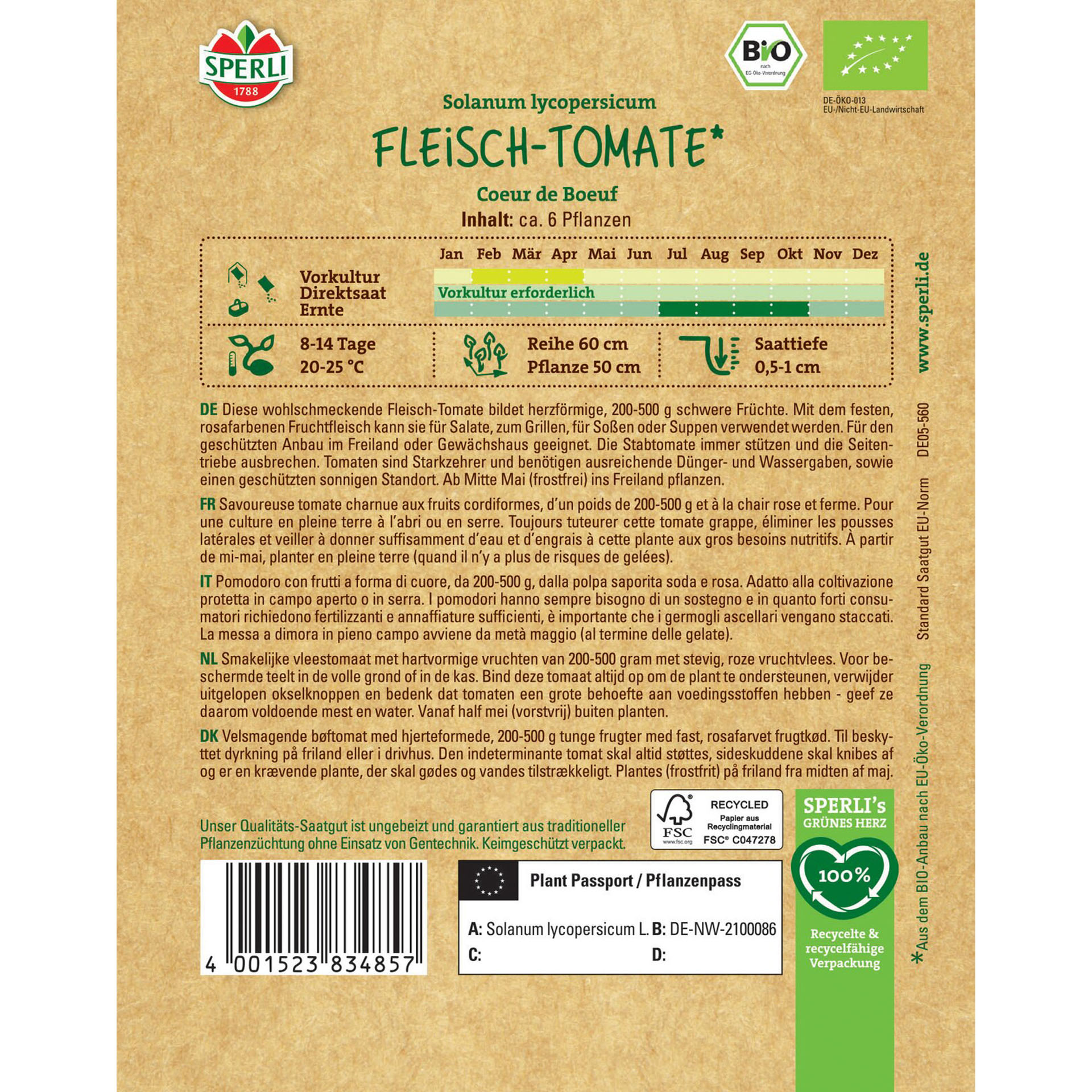 Die BIO Fleisch-Tomate 'Coeur de Boeuf' ist eine aromatisch schmeckende Ochsenherztomate mit festem, rosafarbenen Fruchtfleisch. Ihre herzförmigen Früchte werden 200-500g schwer und können für Salate, zum Grillen, für Soßen oder Suppen verwendet werden.