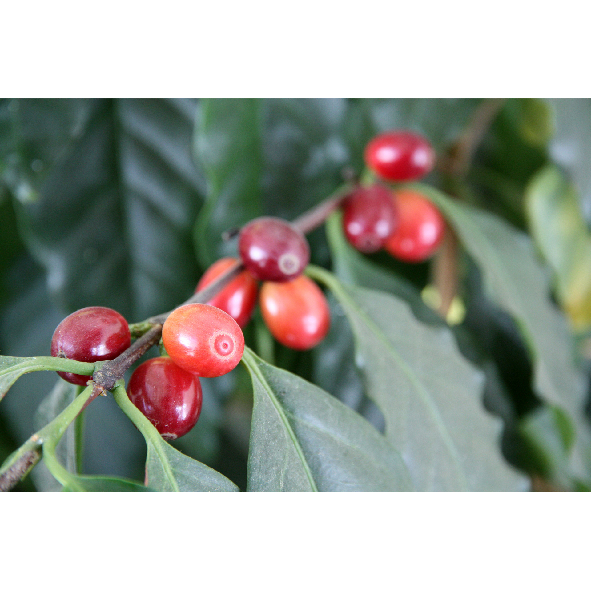 Der Kaffee COFFEA ARABICA ist eine Zimmerpflanze, kann im Sommer aber auch draußen stehen. Nach 4 bis 6 Jahren erscheinen weiße, nach Jasmin duftende Blüten. Sie bilden eine Vielzahl an Beeren, die wie Kirschen aussehen. Diese sind zuerst grün und färben sich später rot. Eine Beere enthält zwei Kaffeebohnen.