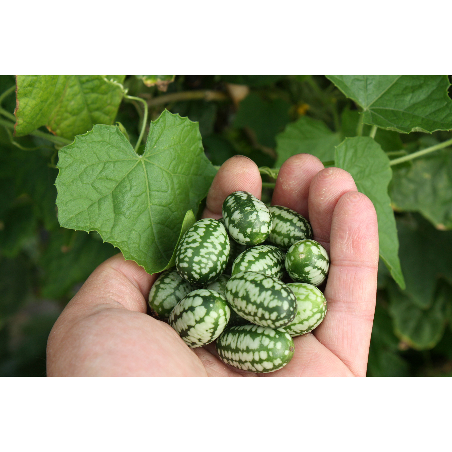 Eigentlich sehen die Mexikanischen Minigurken aus wie Wassermelonen – nur viel viel kleiner. Die ca. 2–3 cm großen Früchte reifen den ganzen Sommer über an einer rankenden Pflanze und schmecken wie eine Salatgurke. Die knackigen Früchte lassen sich gut für Salate verwenden oder als Snack zwischendurch. Ursprünglich stammt die Frucht aus Mexiko, geriet aber leider in Vergessenheit. Mittlerweile erlebt sie ihr Comeback in vielen Gärten. Die neue Blu-Sorte hat eine besonders weiche Schale und hohe Erträge. Wuchshöhe bis 200cm.