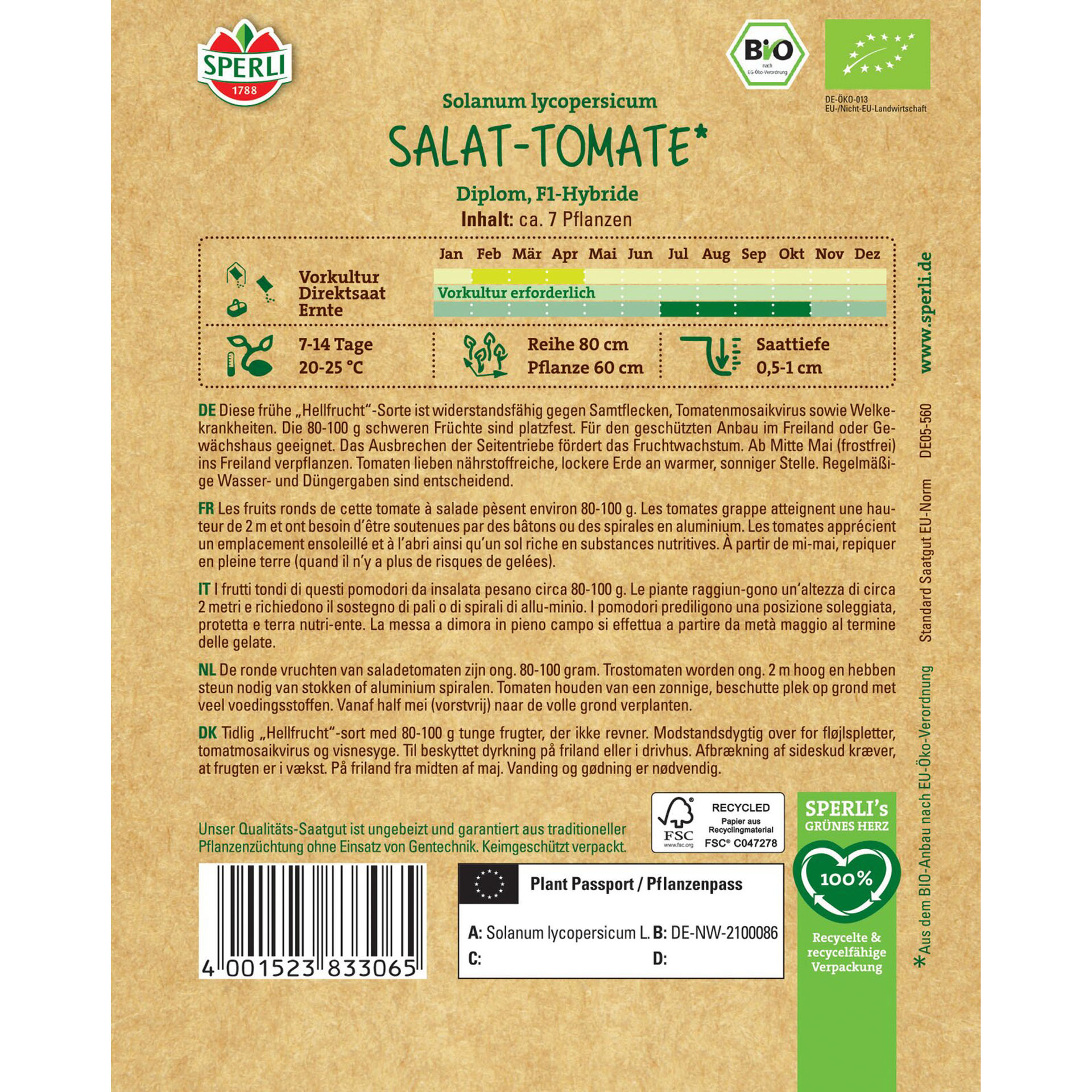 Die BIO Salat-Tomate 'Diplom' ist eine frühe "Hellfrucht"-Sorte. Ihre großen, roten Früchten erreichen eine Gewicht von 80-100g. Sie eignet sich hervorragend für frische Salate und als Beilage zu verschiedenen Gerichten.