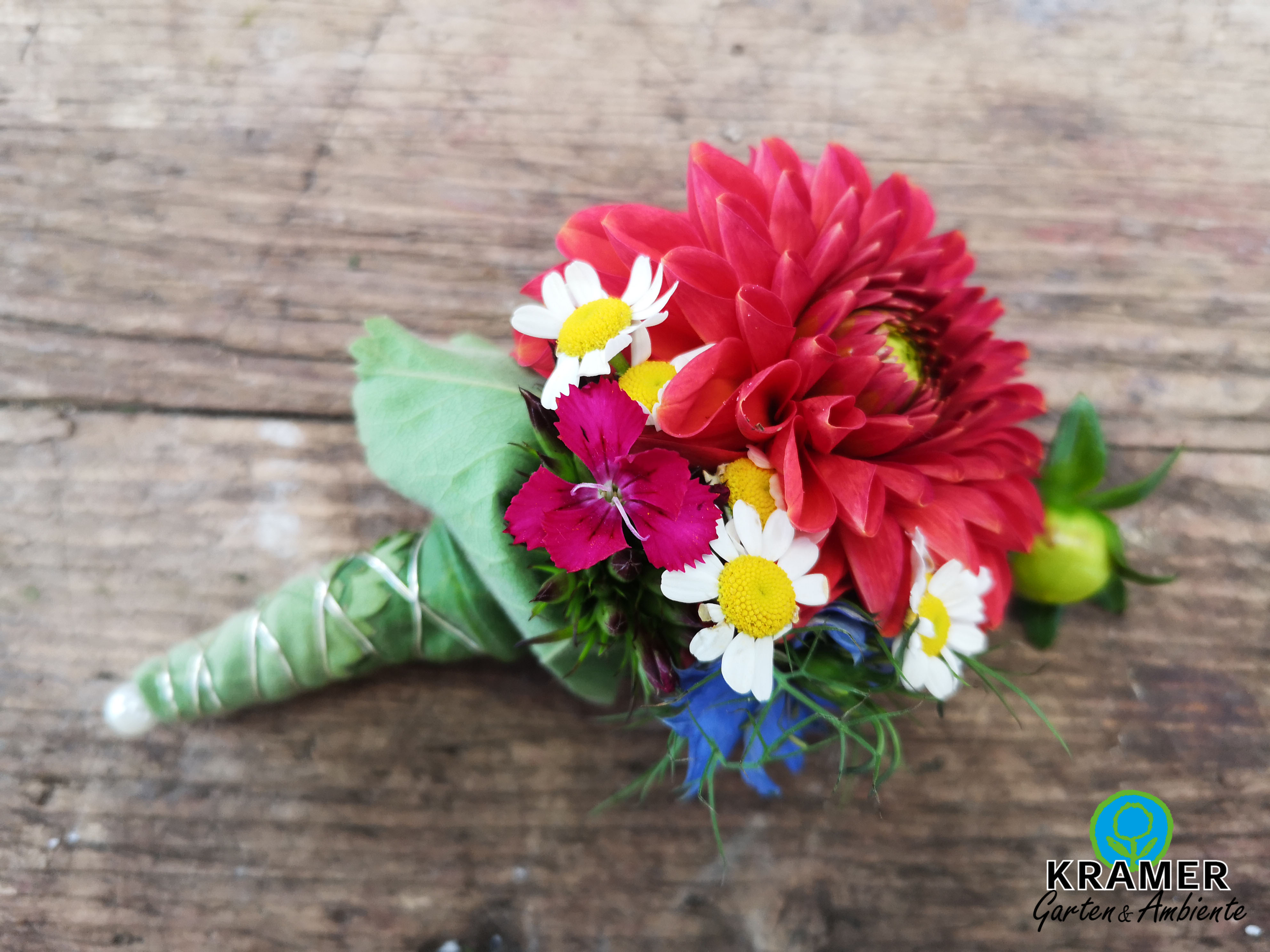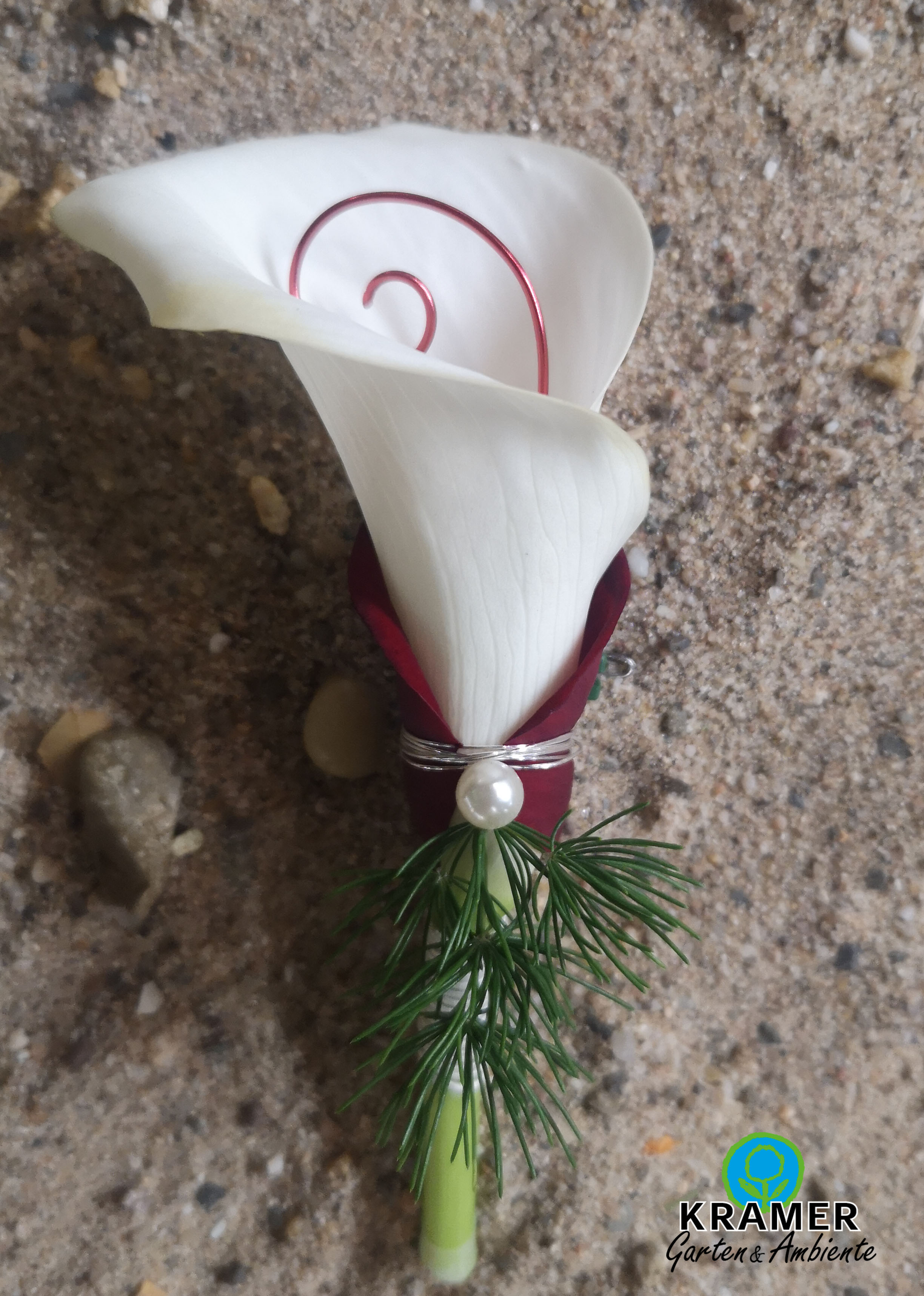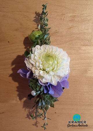 Der Anstecker kann passend zu den Blumen im Brautstrauß gestaltet sein oder ähnliche Elemente enthalten, um ein koordiniertes Erscheinungsbild zu schaffen.