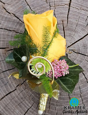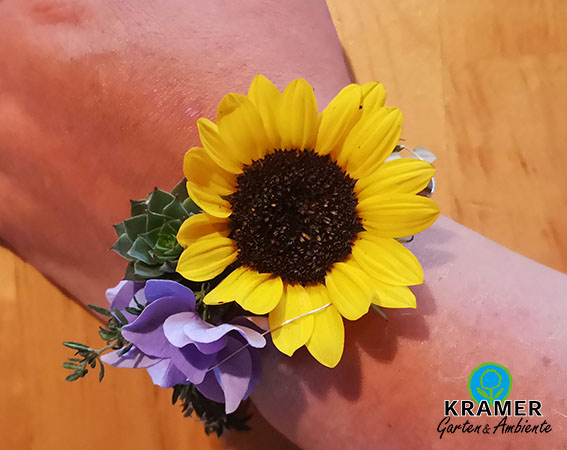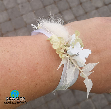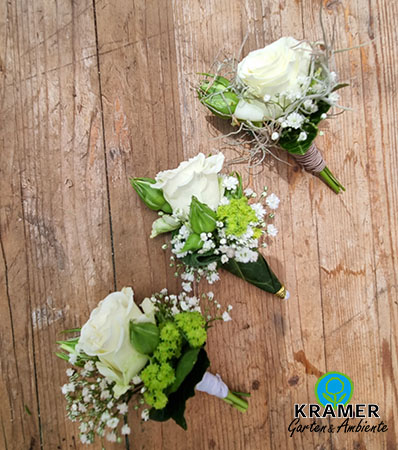 Der Anstecker kann aus einer einzelnen Blume, einer kleinen Blumenkomposition oder anderen dekorativen Elementen bestehen, die üblicherweise am Anzug, Hemd oder von den Brautjungfern am Handgelenk getragen werden.