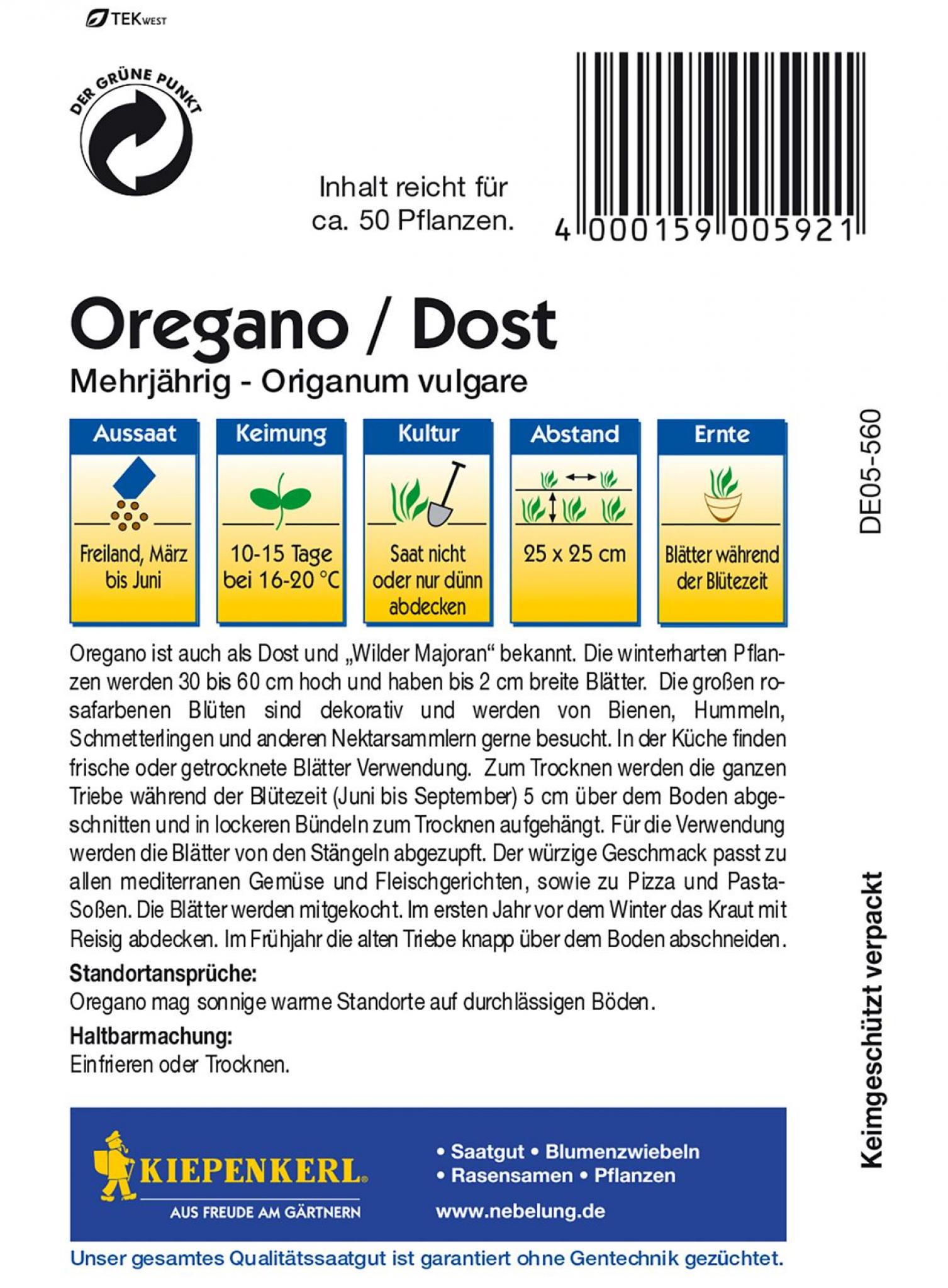 Verwendung: Dient zum Würzen von Tomatensoßen, Pizza und Fleischgerichten. Entwickelt kräftiges Aroma, eignet sich für Tees oder als Badezusatz. Wirkt krampflösend, auch bei Erkältungskrankheiten. Haltbarmachung: Trocknen, einlegen in Öl oder Salz.