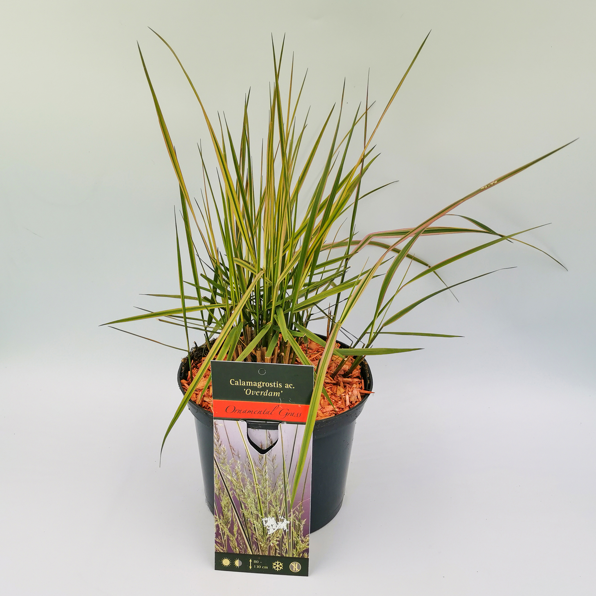 Das Reitgras 'Overdam' ist eines der dekorativsten Ziergräser. Es fällt vor allem durch seine attraktive Blattzeichnung auf. Die langen, schmalen Blätter sind weiß-grün gestreift in Längsrichtung. Das bietet im Sommer einen herrlichen Blickfang, besonders wenn von Juli bis August noch die großen, bräunlichen Blütenrispen erscheinen. Dieses Gras wächst schopfartig und breit ausladend. Es kann eine Höhe von 130cm erreichen. Im Herbst trocknet das Gras nach und nach ein und verfärbt sich bräunlich.