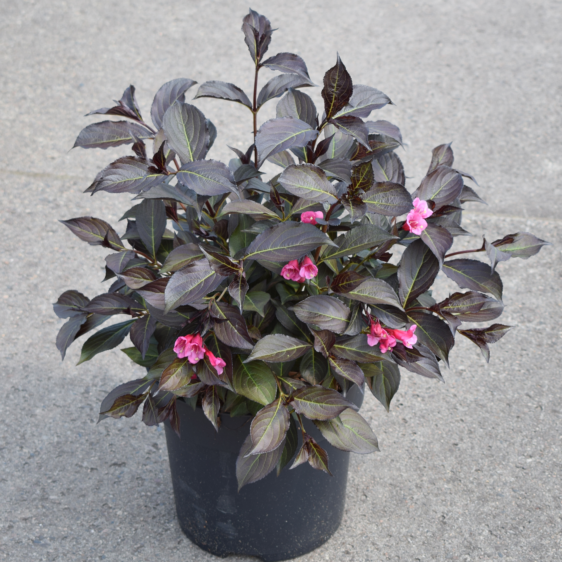 Dieser Zierstrauch hat imposantes dunkelrotes Laub. Besonders intensiv ist die Färbung im Frühjahr beim frischen Austrieb. Im Mai und Juni kommen dann große, leuchtend pinkfarbene, trichterförmige Blüten hinzu. Diese heben sich kontrastreich vom dunklen Laub ab, das ist ein herrlicher Anblick. Dieser Strauch kann bis 3m hoch werden und dabei auch breit ausladend.