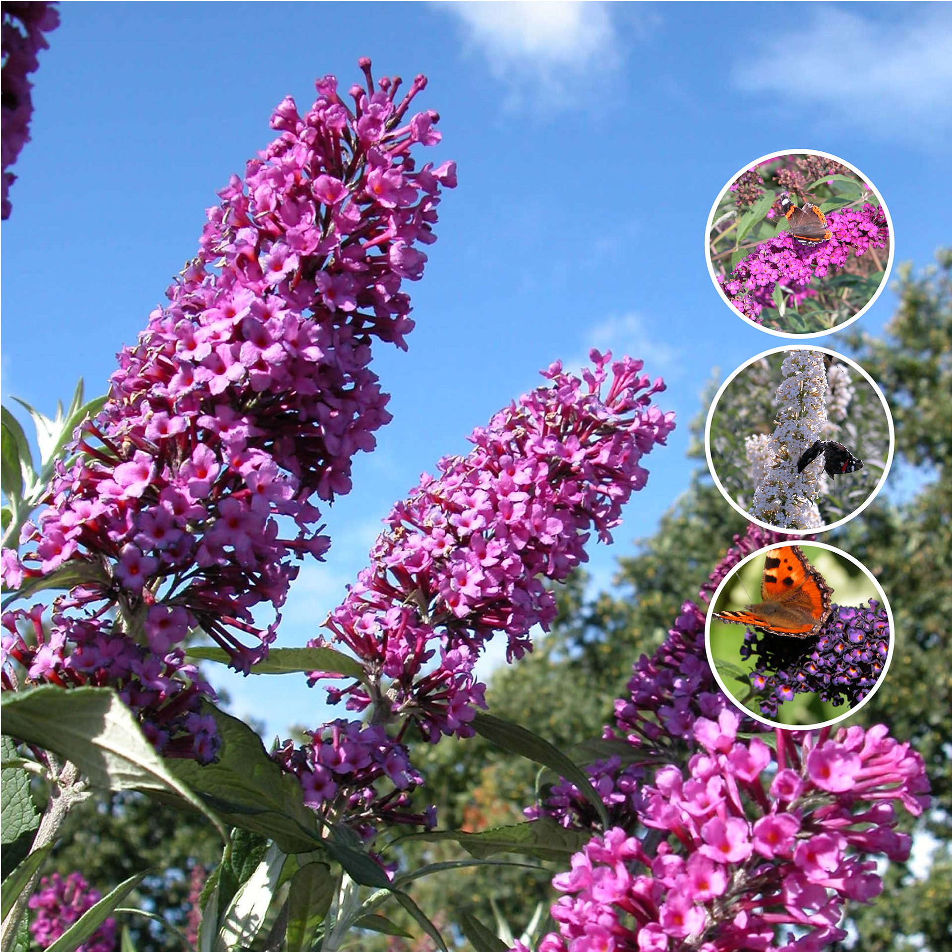 Der Sommerflieder wird oft auch Schmetterlingsstrauch genannt. Tatsächlich zieht es Schmetterlinge und andere Insekten magisch an, die Blüten sind immer gut besucht. Die langen Blütenrispen erscheinen von Juli bis Oktober und sind je nach Sorte lila, rosa oder weiß.