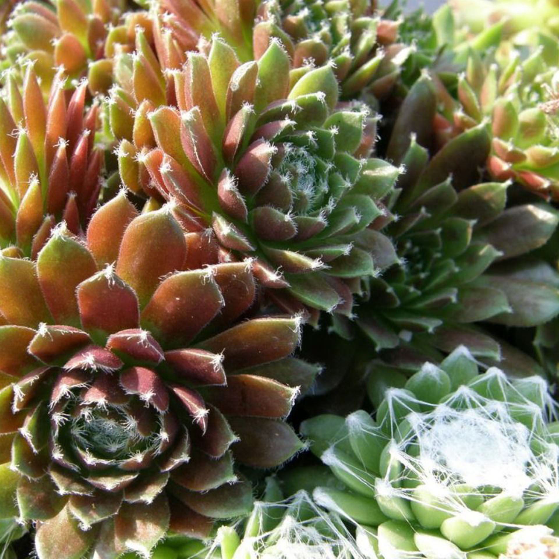 Hauswurz ist eine Sukkulente, also eine Pflanze, die Wasser in ihren Blättern, Stielen oder Wurzeln speichert, um in trockenen Perioden zu überleben. Diese Sorte hat rosettenförmige, polsterbildende, rotbraune Blätter, die 3-5cm hoch werden. Von Juni bis Juli erscheinen aus der Mitte der Rosetten heraus rosa Blüten an 15-20cm langen Blütenstängeln. Auffallend ist die silbrige Behaarung der Blattspitzen.